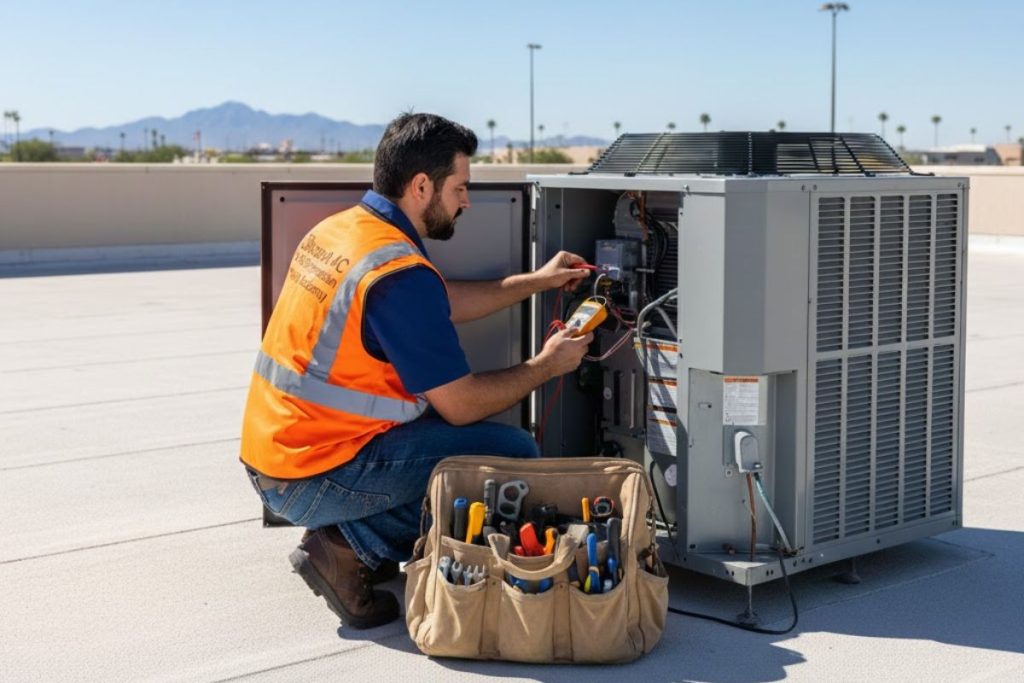 In my 20+ years working across the Metro Phoenix area, specifically the West Valley towns like Goodyear and Avondale, I’ve seen that the heat here is uniquely brutal on commercial equipment. When the mercury hits 115 degrees Fahrenheit, your RTU is running constantly. It’s not just the temperature; it’s the fine, dusty desert air and the sheer duration of the cooling season.