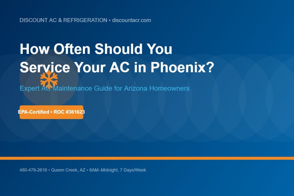 Don’t wait until your AC breaks down in 115°F heat to call. Discount AC & Refrigeration provides spring and fall tune-ups throughout the Phoenix metro — EPA-certified technicians, ROC #361623, available 6 AM–midnight, 7 days a week. Call 480 478-2616 or book online at our contact page.
