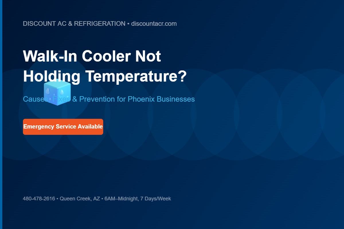 Discount AC & Refrigeration provides emergency commercial refrigeration repair in Phoenix 6 AM to midnight. If your walk-in cooler is currently above safe temperature (41°F), call 480-478-2616 immediately.